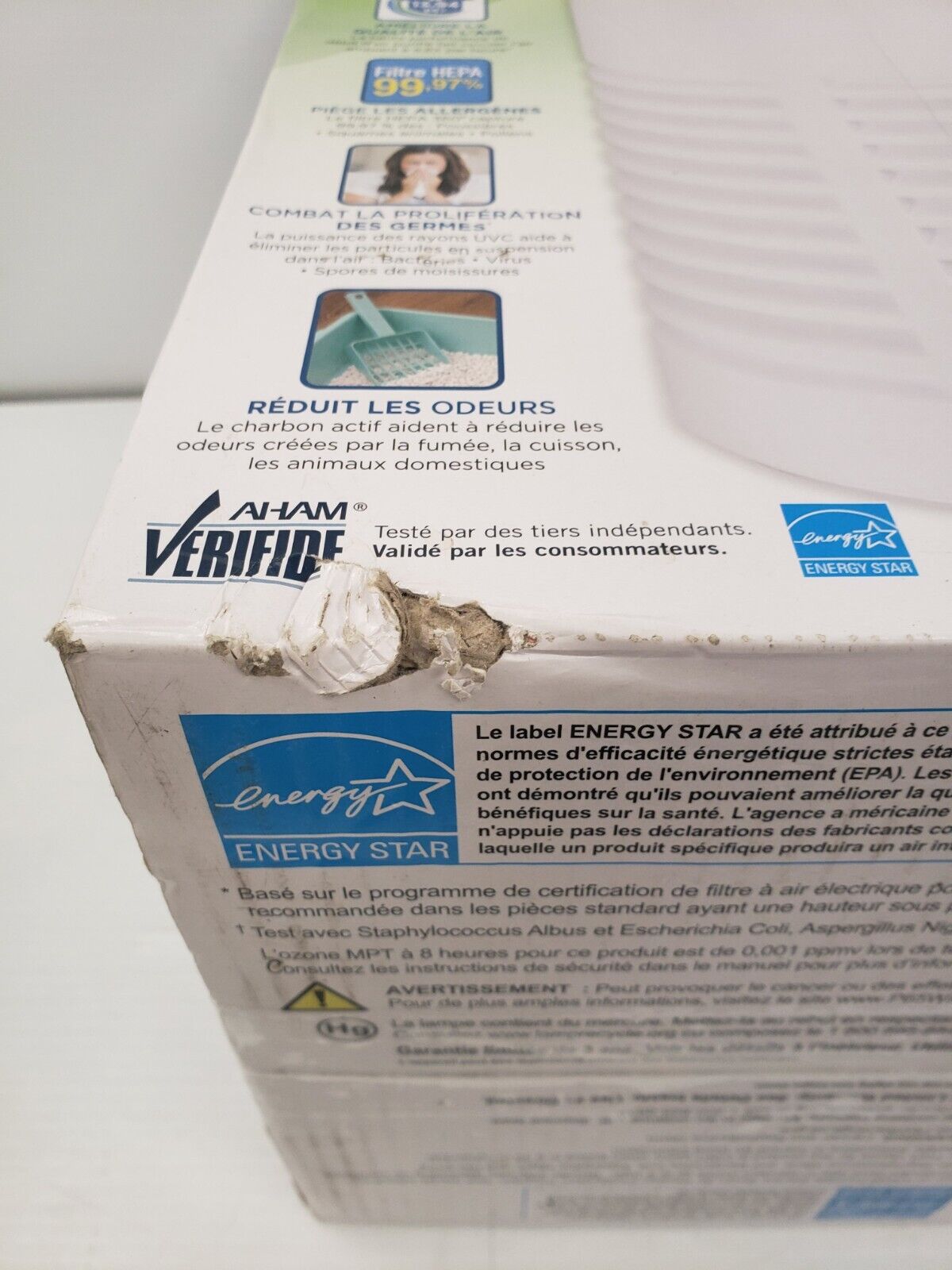 In used condition, box is damaged.Germ Guardian Air Purifier