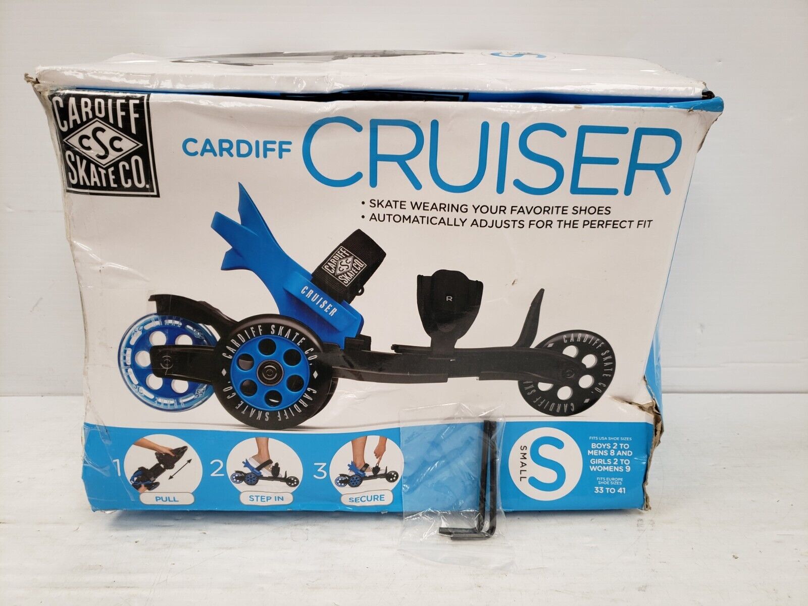 In good used condition, scuffs on wheels, box is damaged.Cardiff Cruiser Skates